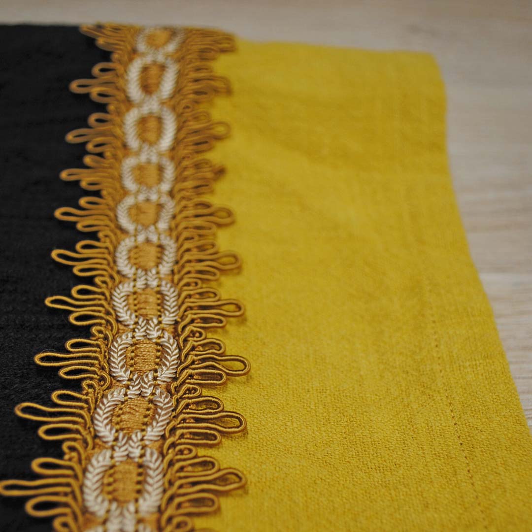 The Fushimi Inari men’s cardigan is made from a black cable knit fabric that gives the cardigan a powerful, layered look. The sturdy structure provides depth and a beautiful silhouette. Linen accents, including the ochre yellow details on the cuffs and along the bottom, add contrast and refinement. The panels extend into two characteristic points that enhance the shape and are subtly accented with linen and a carefully chosen vintage trim.
