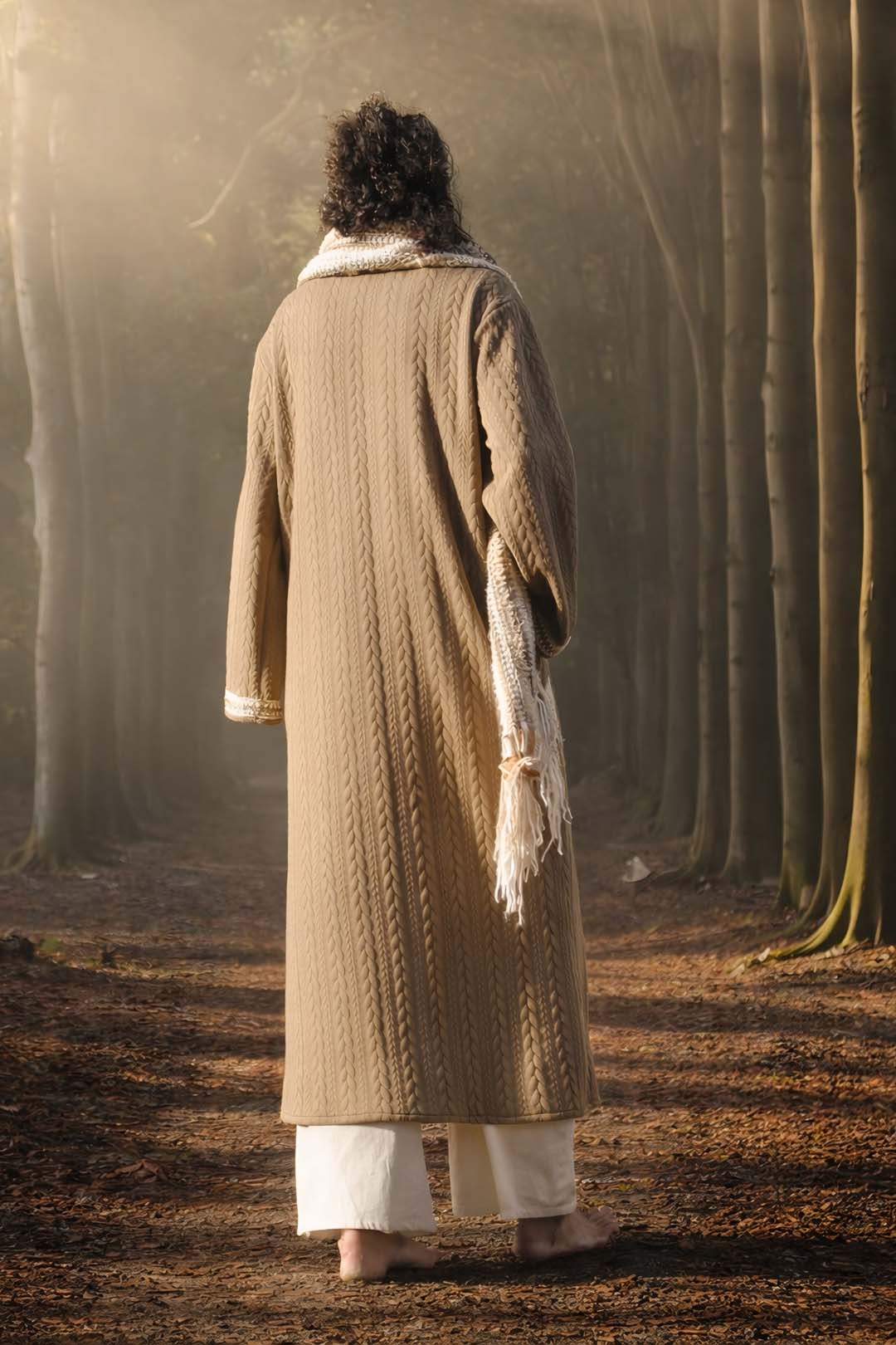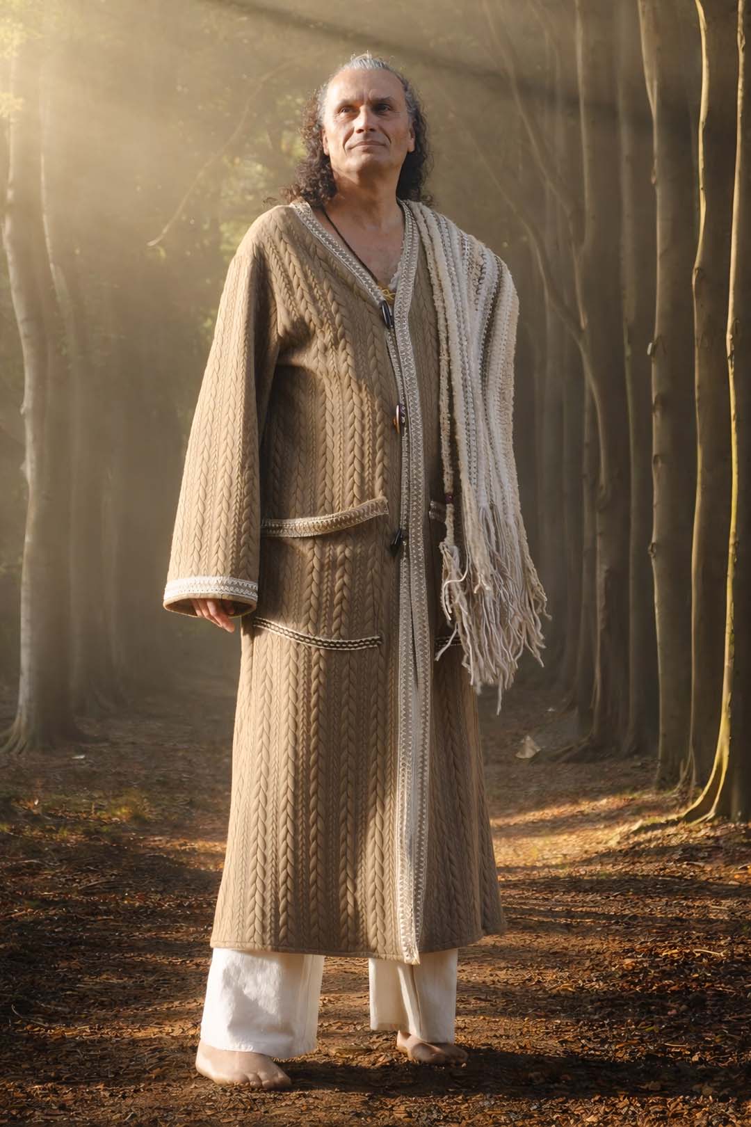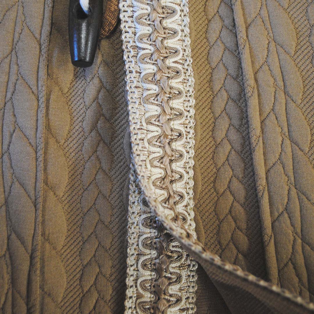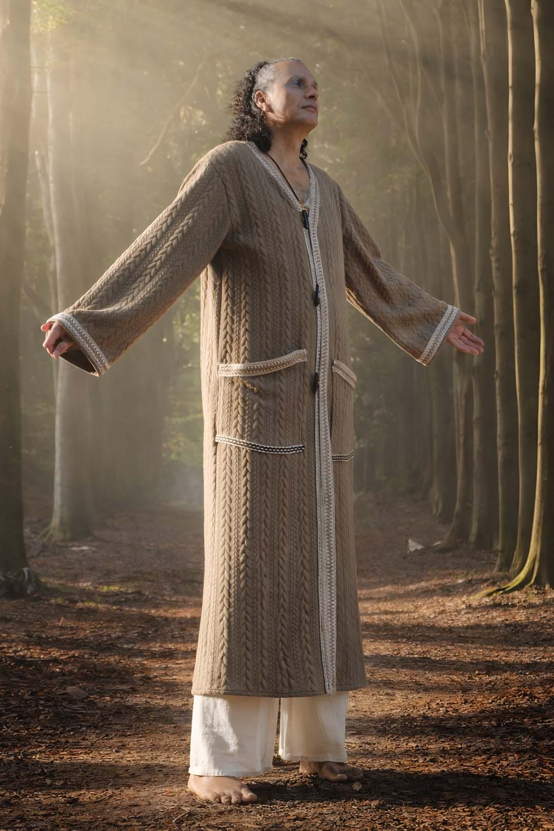 Long men’s cardigan made of cable-knit jersey in a dark sand color with vintage decorative trim at the front and on the pockets. It closes with toggle buttons, soft, warm, and comfortable. Features wider sleeves, neutral and versatile. The standard length of the cardigan is 133 cm; should you wish it longer/shorter, you can indicate this in the ‘desired length’ field below.