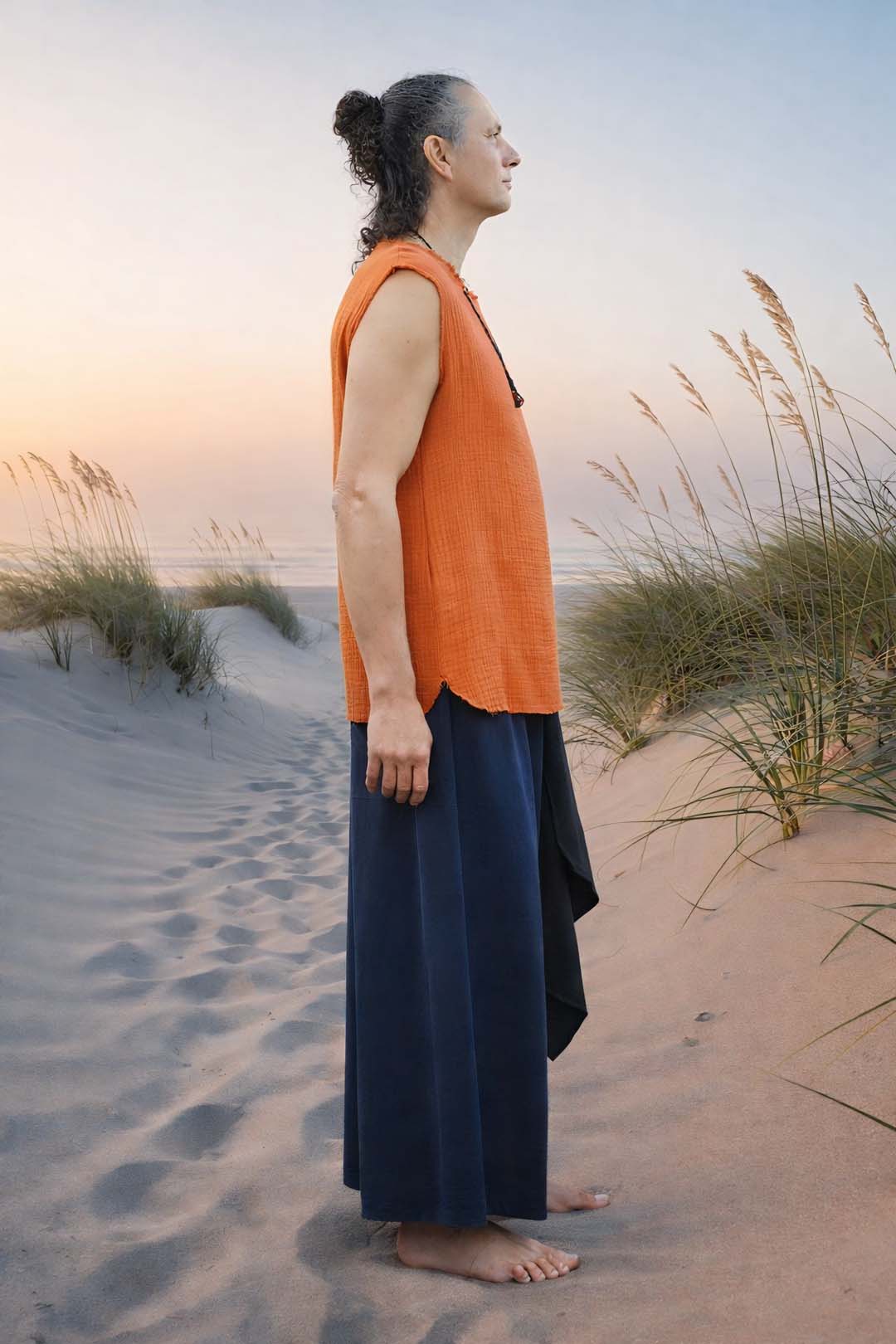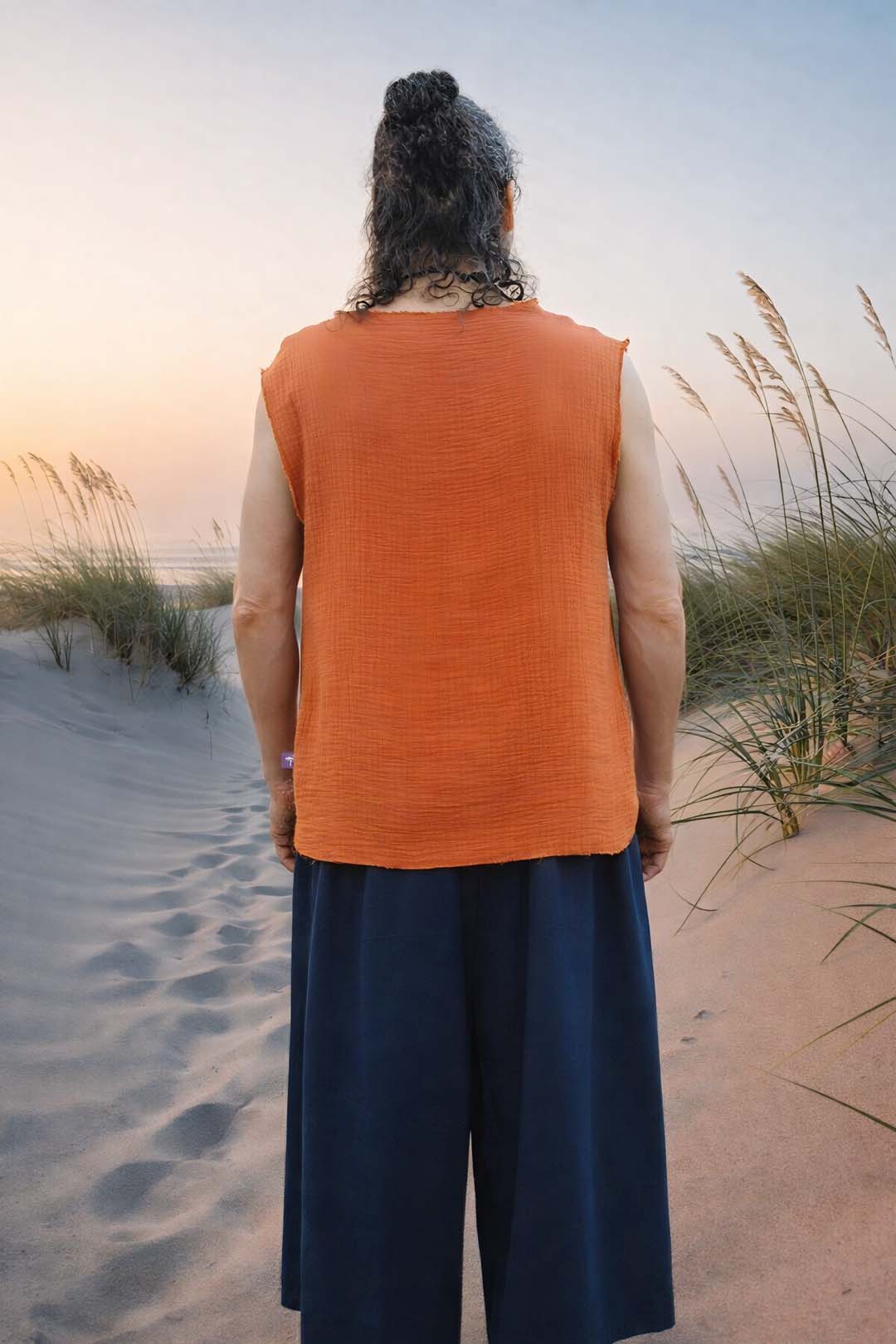 The Mekong men’s shirt is made from double-layered muslin cotton, with a soft and light texture. The brick color adds warmth and natural elegance. The light material makes the shirt drape smoothly and breathe excellently, ideal for layering or wearing separately.