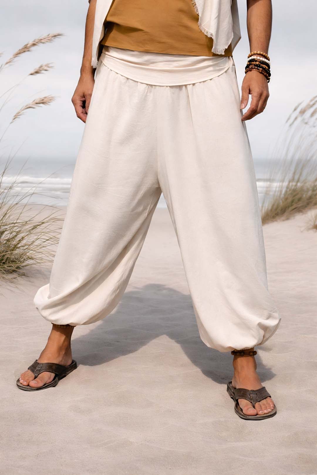Soft cream white cotton harem pants with a unique waistband and pleated design at the waist. Elastic bottom for a puff effect, spacious fit, Eastern-inspired and comfortable. Perfect for moving, dancing or relaxing.