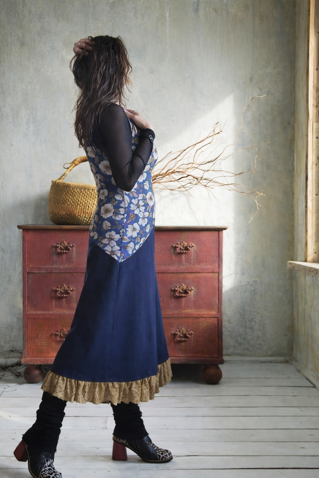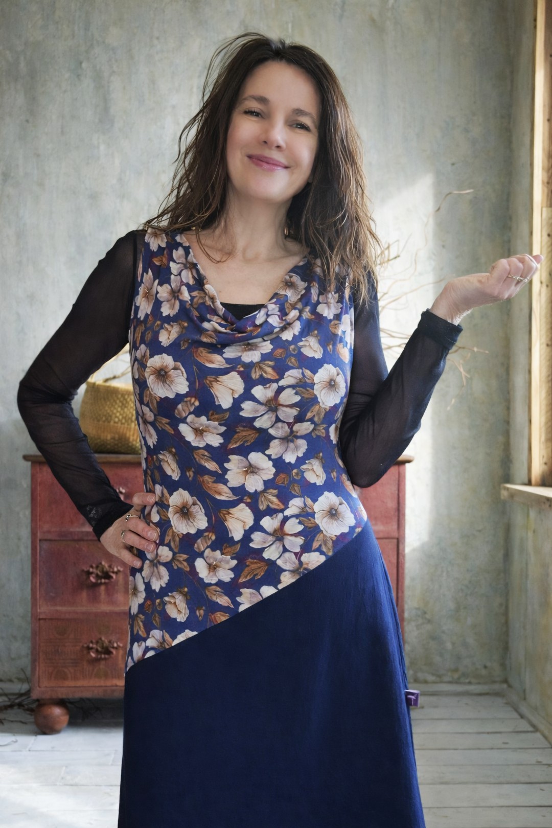 Taralyn embodies the energy of playfulness and flow. The name evokes movement, as if fabric and form find each other effortlessly. This dress is made from a floral tricot that transitions diagonally into a dark blue washed cotton skirt. The waterfall neckline drapes softly along the body, and at the bottom, a strip of ochre yellow, flowing lace provides a surprising accent. Feminine, unique, and with a natural flow.
