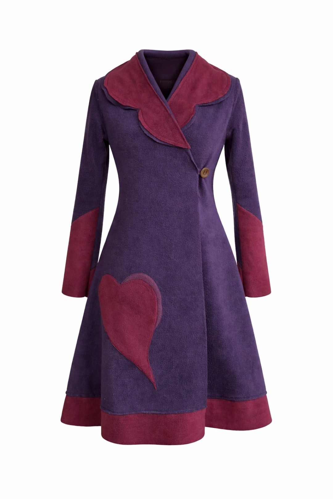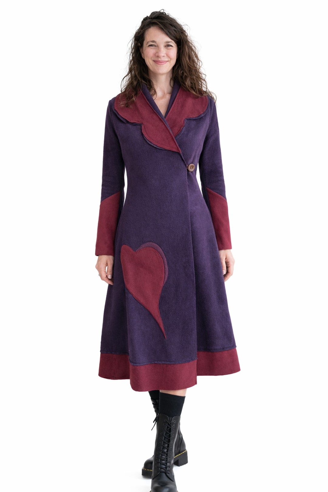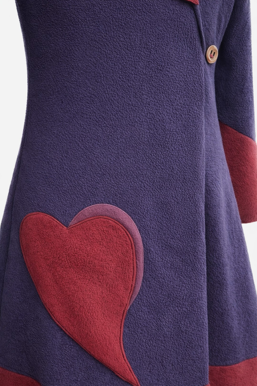Uniek handgemaakt jasvest voor dames van aubergine en paars fleece, met een bijzondere hartvormige kraag en hart-applicaties. Zacht, warm en kunstzinnig. Te dragen als jas én vest, geschikt voor binnen en buiten. Een exclusief Tula Moon-ontwerp, comfortabel, vrouwelijk en op maat gemaakt.