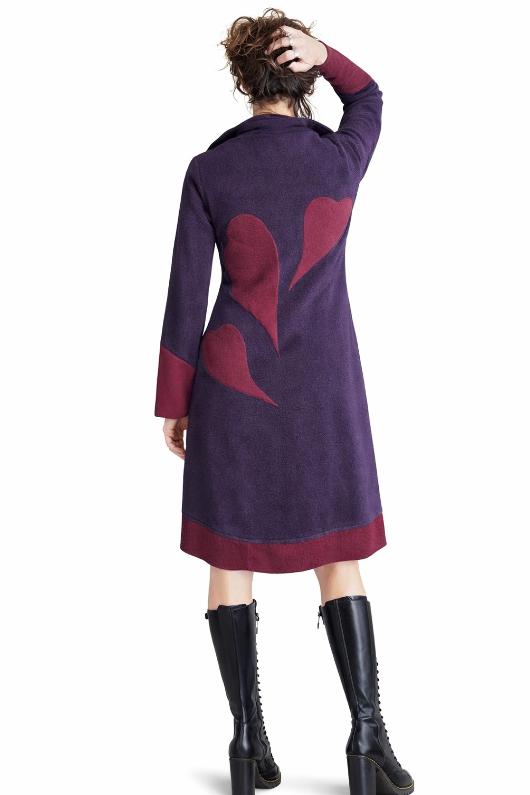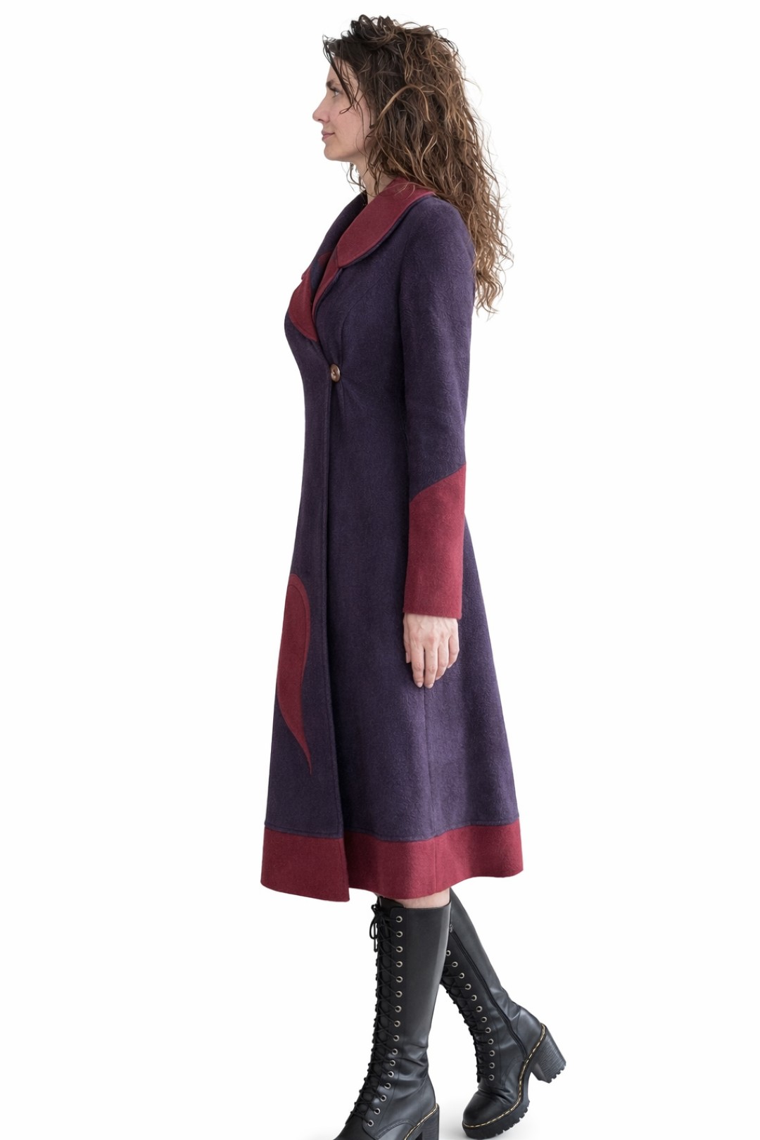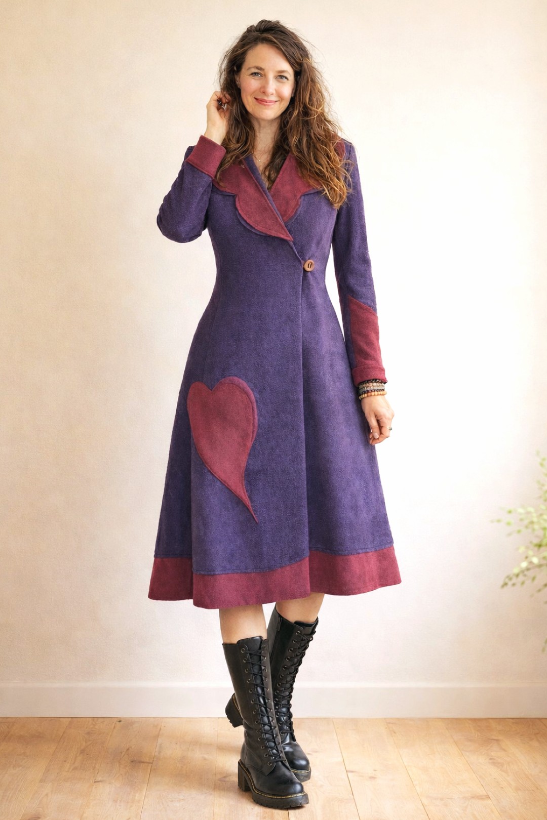 Uniek handgemaakt jasvest voor dames van aubergine en paars fleece, met een bijzondere hartvormige kraag en hart-applicaties. Zacht, warm en kunstzinnig. Te dragen als jas én vest, geschikt voor binnen en buiten. Een exclusief Tula Moon-ontwerp, comfortabel, vrouwelijk en op maat gemaakt.