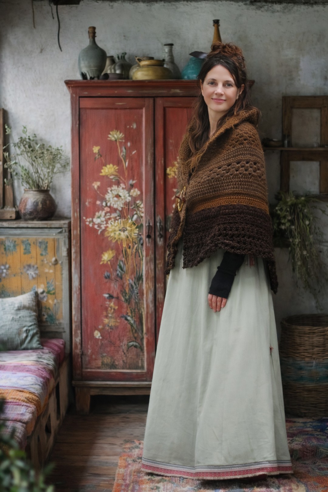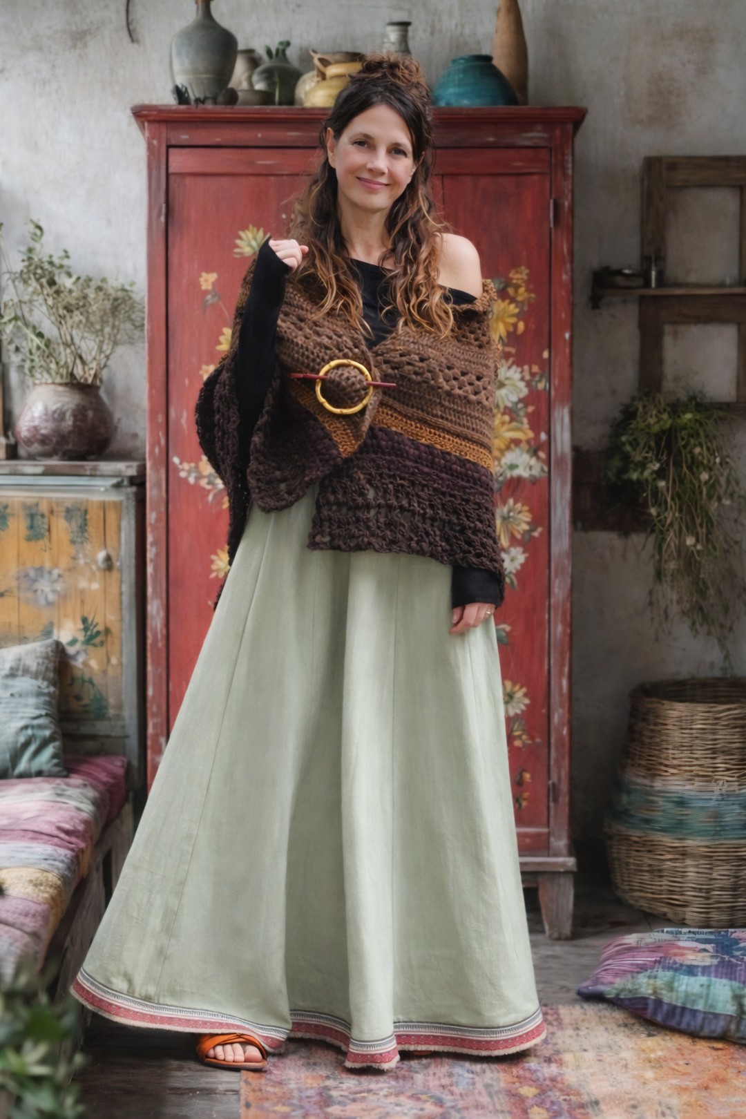 Deze poncho werd speciaal voor jou met liefde handgemaakt, een uniek exemplaar dat warmte, comfort en vakmanschap uitstraalt. Draag Aveline over je schouders tijdens koele dagen, om je verbonden te voelen met de natuur en voel de zorg, liefde en tijdloze elegantie in elke steek à³f zie voor je… een cirkel van warmte en licht, waar het vuur zacht knettert en de vlammen dansen onder de sterrenhemel. Rondom dit buitenvuur zitten vrienden en geliefden, samen zingend of spelend op instrumenten, terwijl de kou van de nacht plaatsmaakt voor een gevoel van verbondenheid. Het is een plek van verhalen, muziek en magie, waar iedere vonk de sfeer van samenzijn versterkt en het hart verwarmt. Laat Aveline bij je zijn.