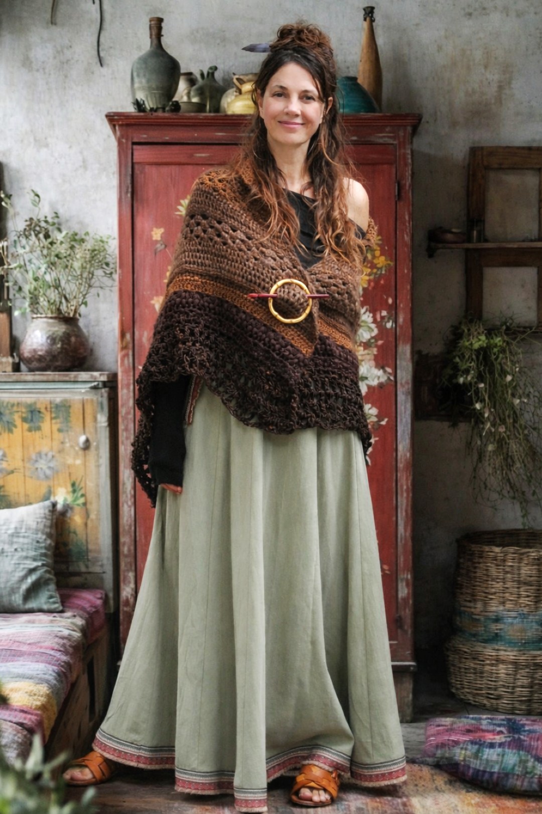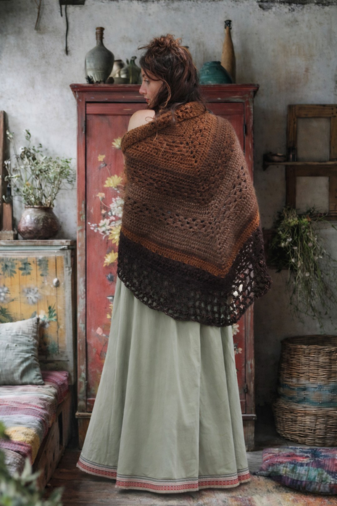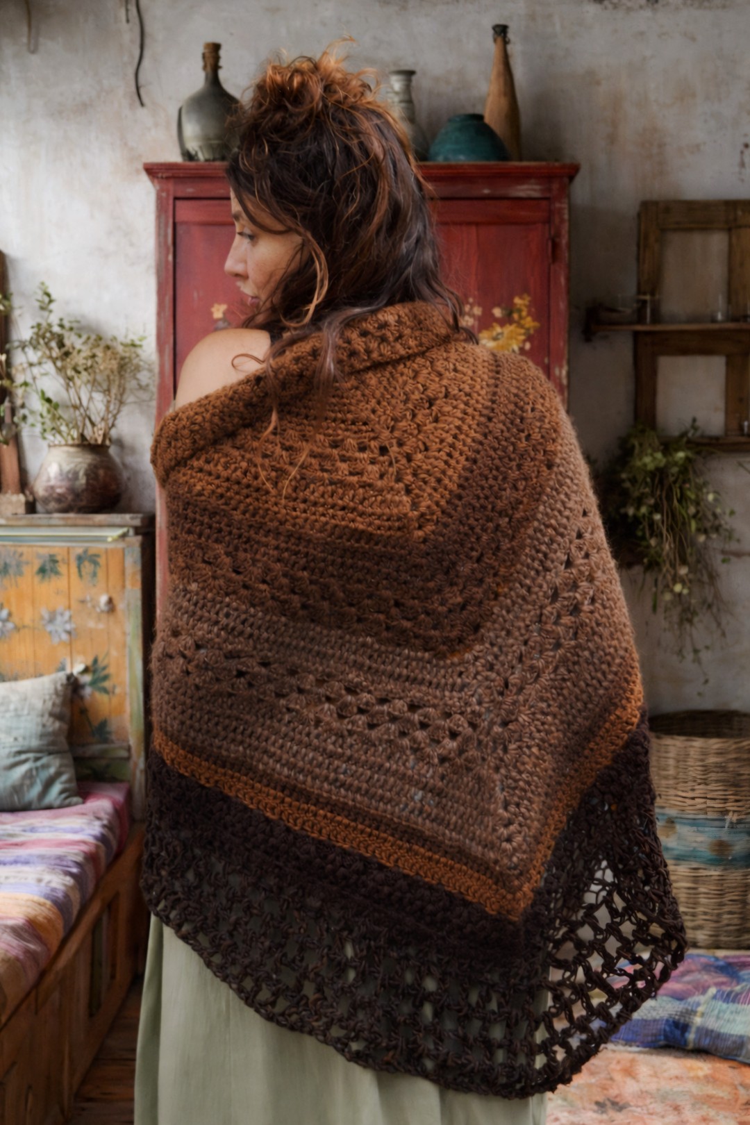 Handgemaakte omslagdoek/ poncho van 100% duurzame wol in verschillende warme bruine tinten. Zacht, comfortabel en stevig. Ze sluit met een bamboe ring en houten pin. Uniek, met bijzondere steken en tijdloze kwaliteit… een natuurlijke en stijlvolle toevoeging aan je garderobe.