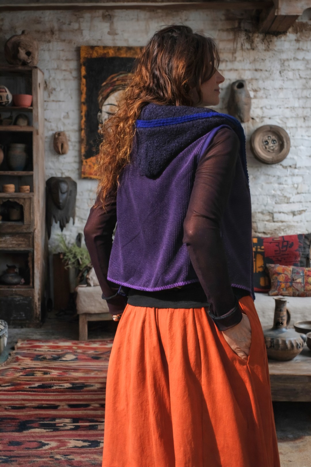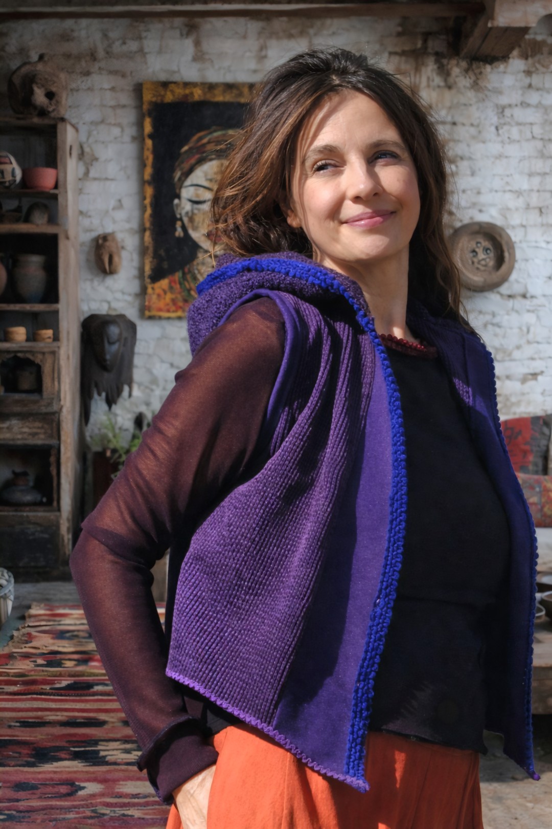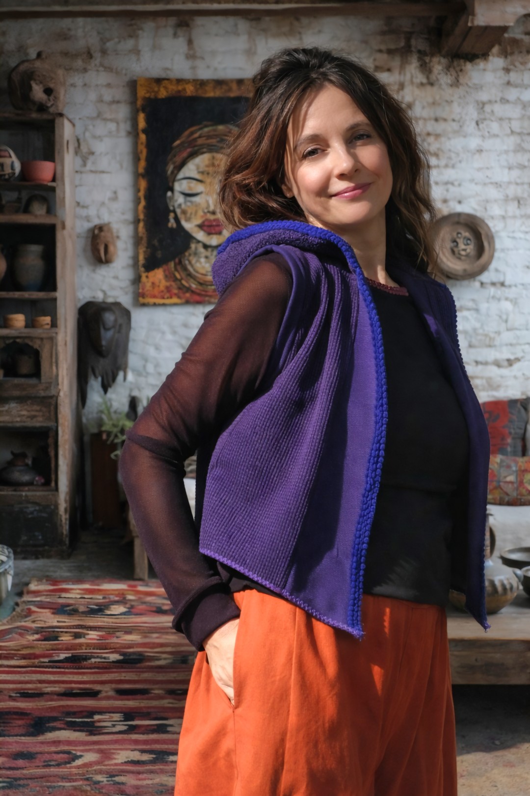 Een uniek, mouwloos jasje in diepe paarstinten, gemaakt van drie bijzondere stoffen: corduroy, wol en bouclé. Afgewerkt met vintage sierwol en voorzien van een zachte capuchon. Een eigen ontwerp vol karakter en verfijning. Mooi te combineren met broek Freya en op maat te maken.