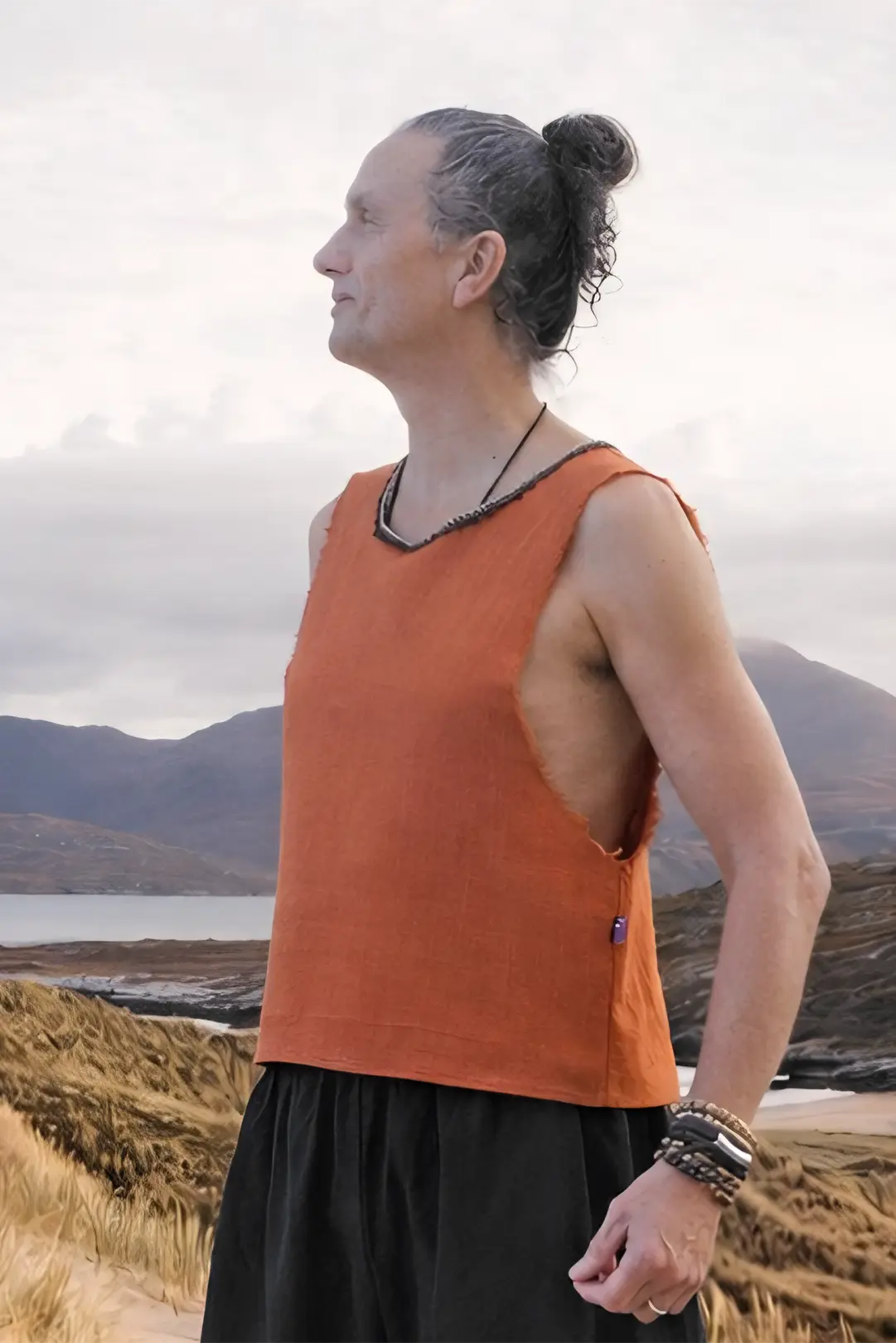 Heren tanktop in warm brique van 100% gewassen katoen, rafelranden langs de armsgaten en hals afgewerkt met een vintage sierband. Ademend, stijlvol en duurzaam handgemaakt in het Tula Moon atelier.