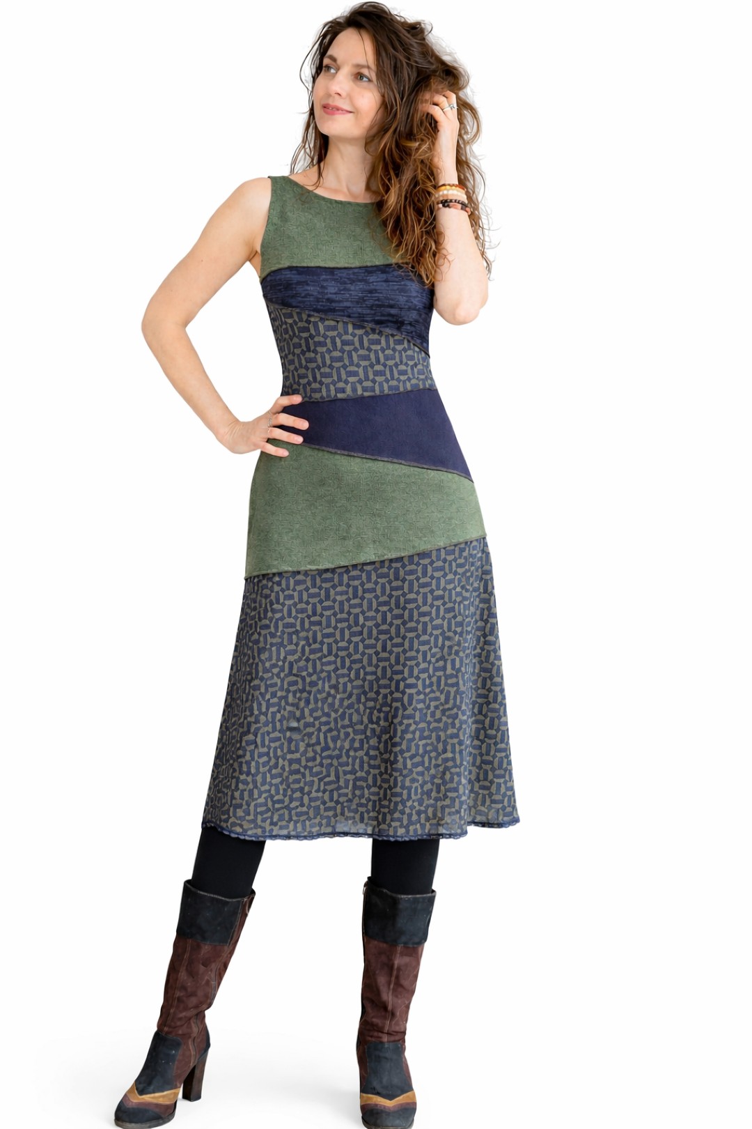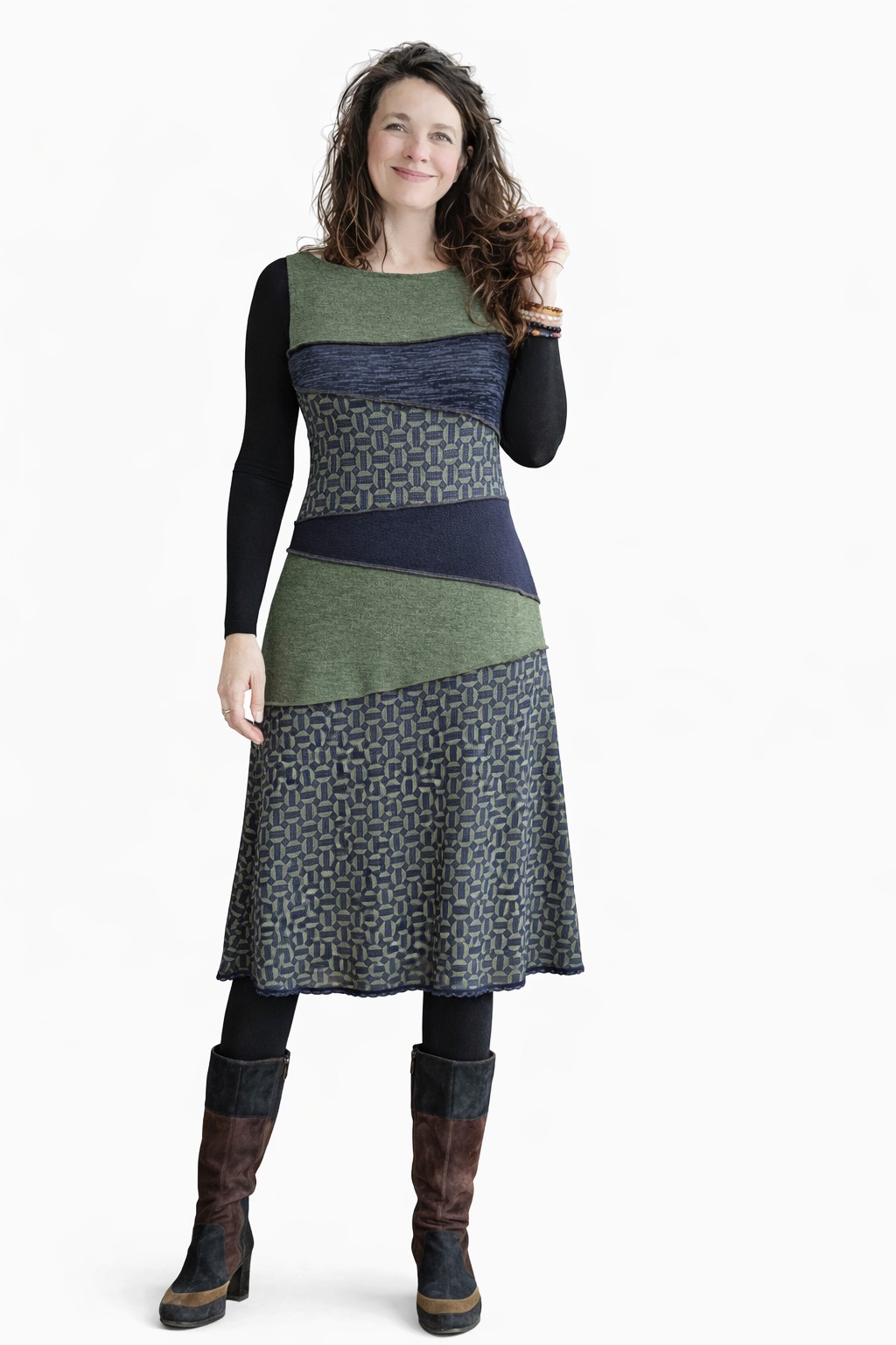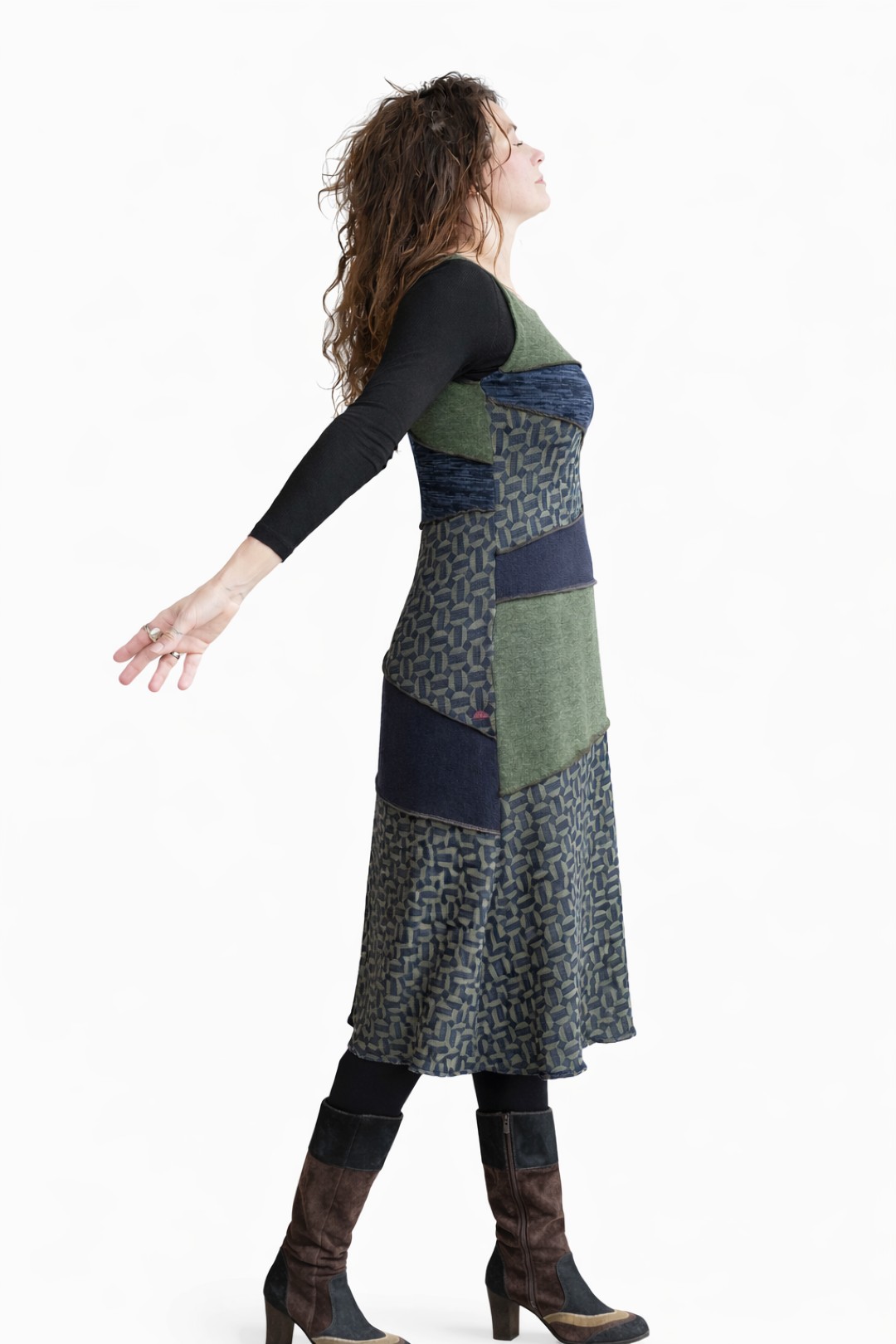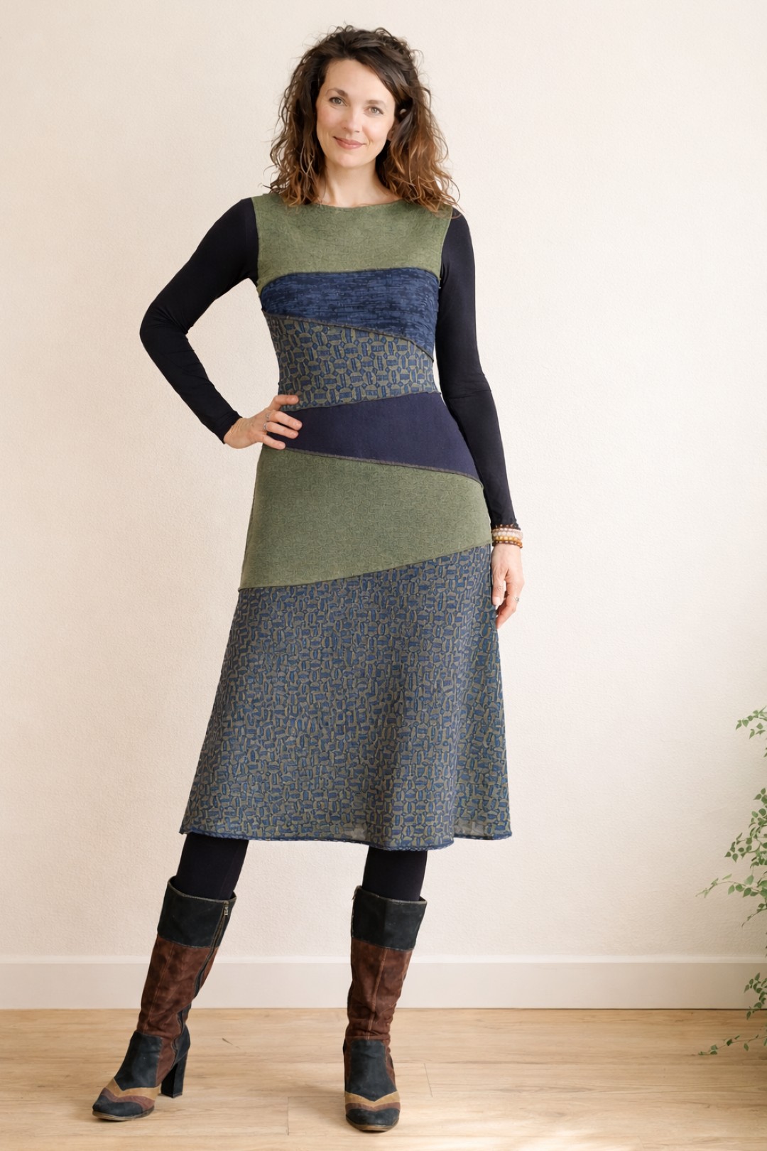 Tish draagt de energie van verbinding en zachtheid in zich. De naam staat voor samenbrengen wat op zichzelf al mooi is, maar samen een nieuw geheel vormt. Deze midi dress is een kunstig puzzelwerk van verschillende gebreide jersey’s in olijfgroen, donkerblauw en een subtiele print. Vrouwelijk van lijn, eigenzinnig van karakter en afgewerkt met een fijn kantje aan de onderzijde. Een jurk die met je meebeweegt en je omhult, met aandacht en gevoel ontworpen.
