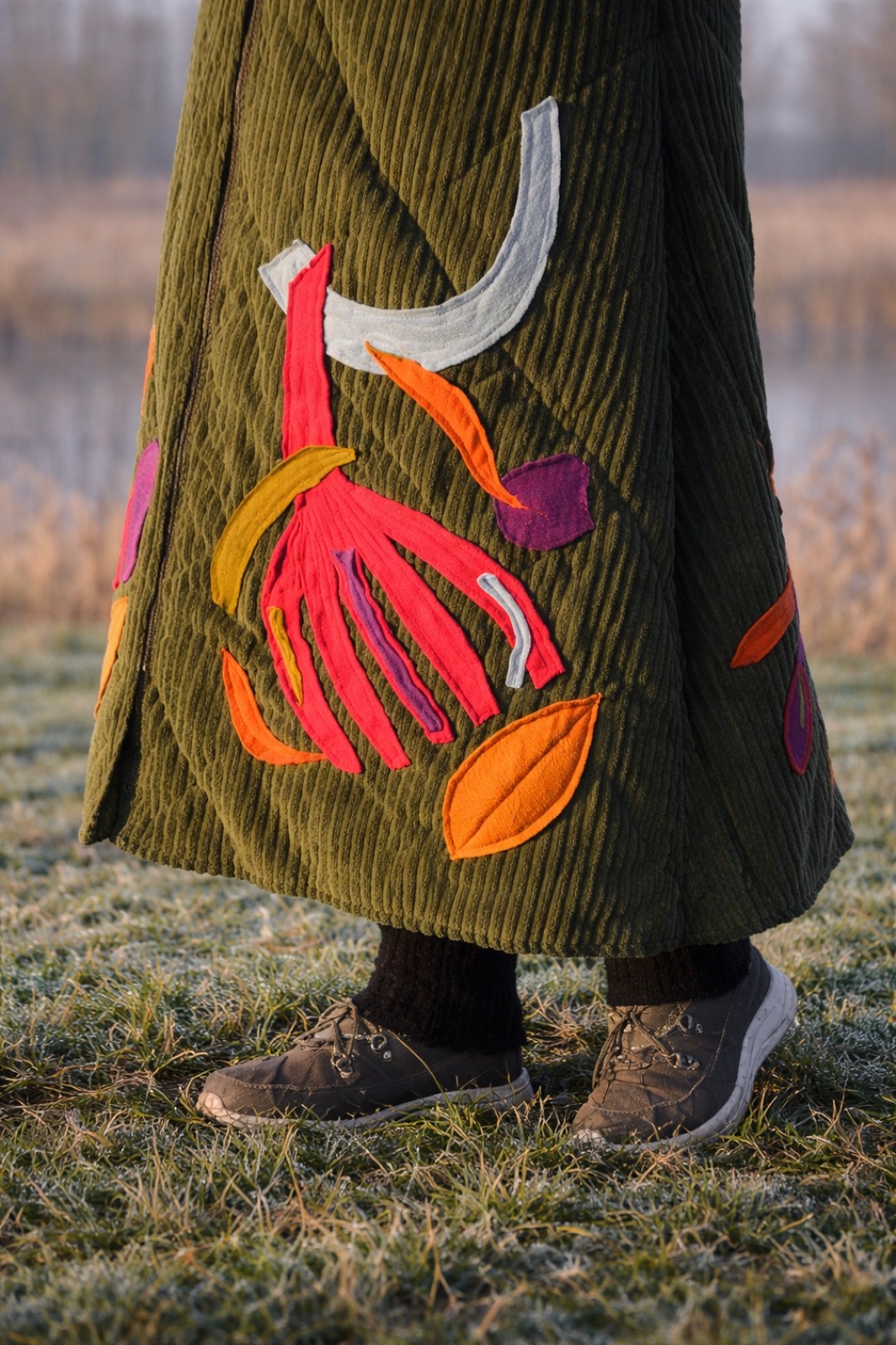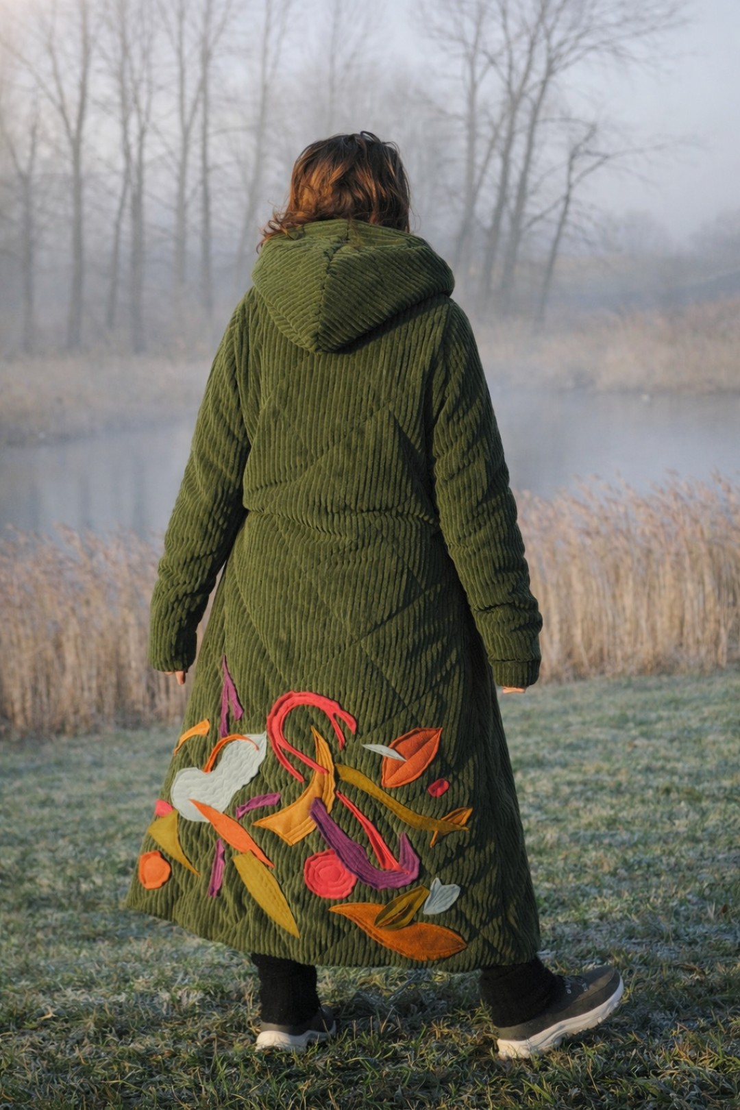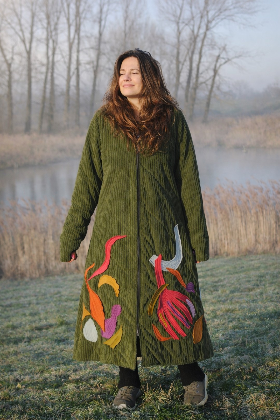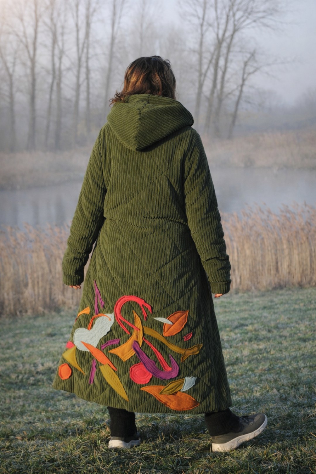Veda is een lange, warme winterjas van zachte mosgroene ribstof, gewatteerd en volledig gevoerd met een bijpassende pluche voering. Een uniek kunstwerk om te dragen, met handgemaakte fleece applicaties en intuïtieve stiksels. Eén enkel exemplaar, passend voor maat S en M.