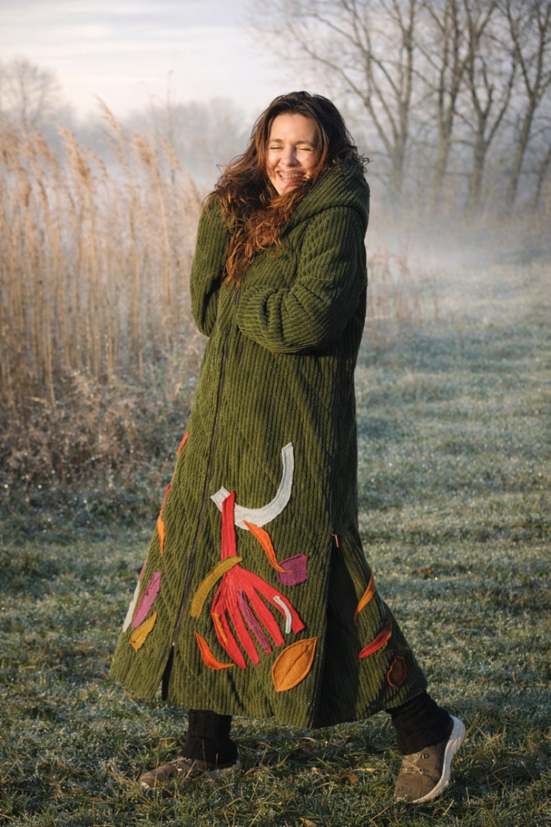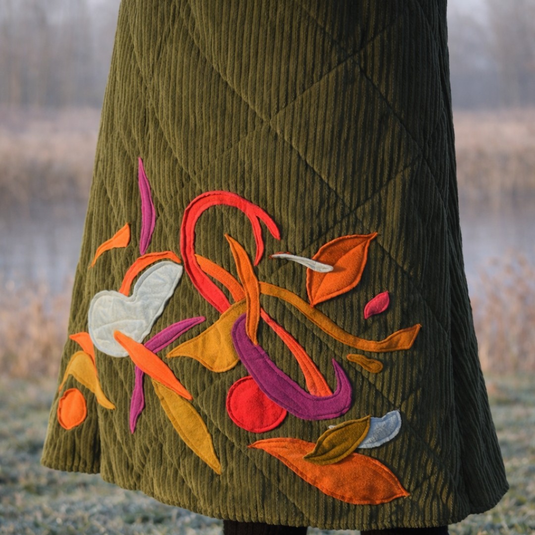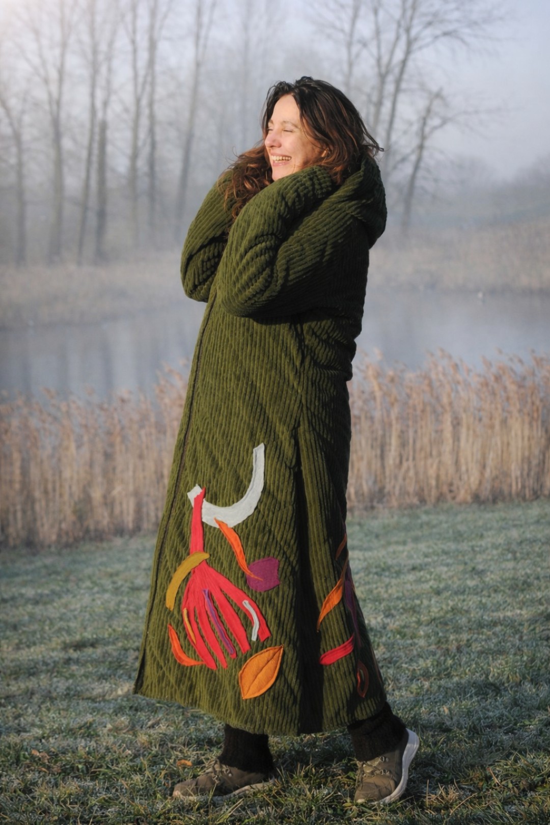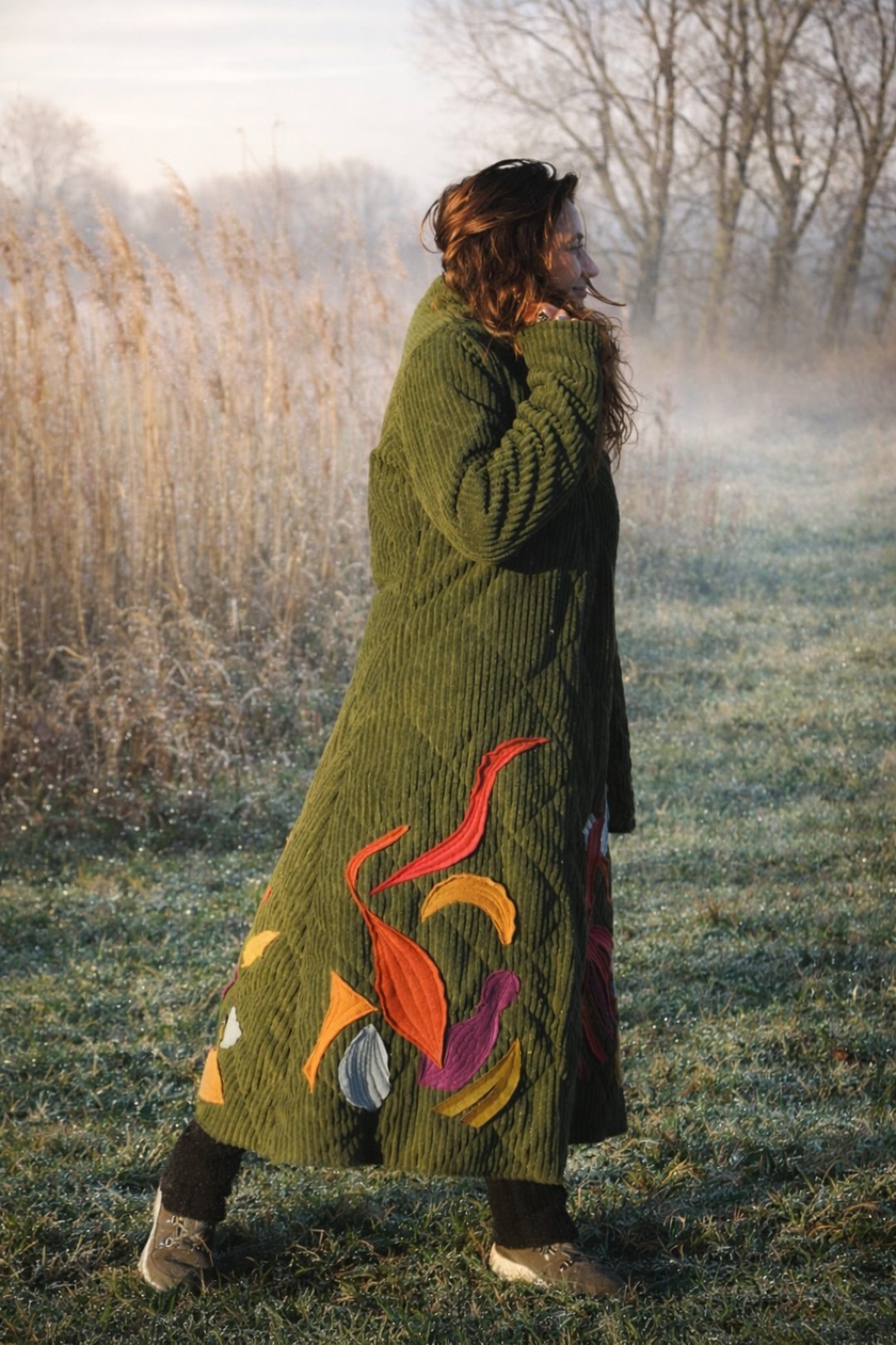 Veda is een lange, warme winterjas van zachte mosgroene ribstof, gewatteerd en volledig gevoerd met een bijpassende pluche voering. Een uniek kunstwerk om te dragen, met handgemaakte fleece applicaties en intuïtieve stiksels. Eén enkel exemplaar, passend voor maat S en M.